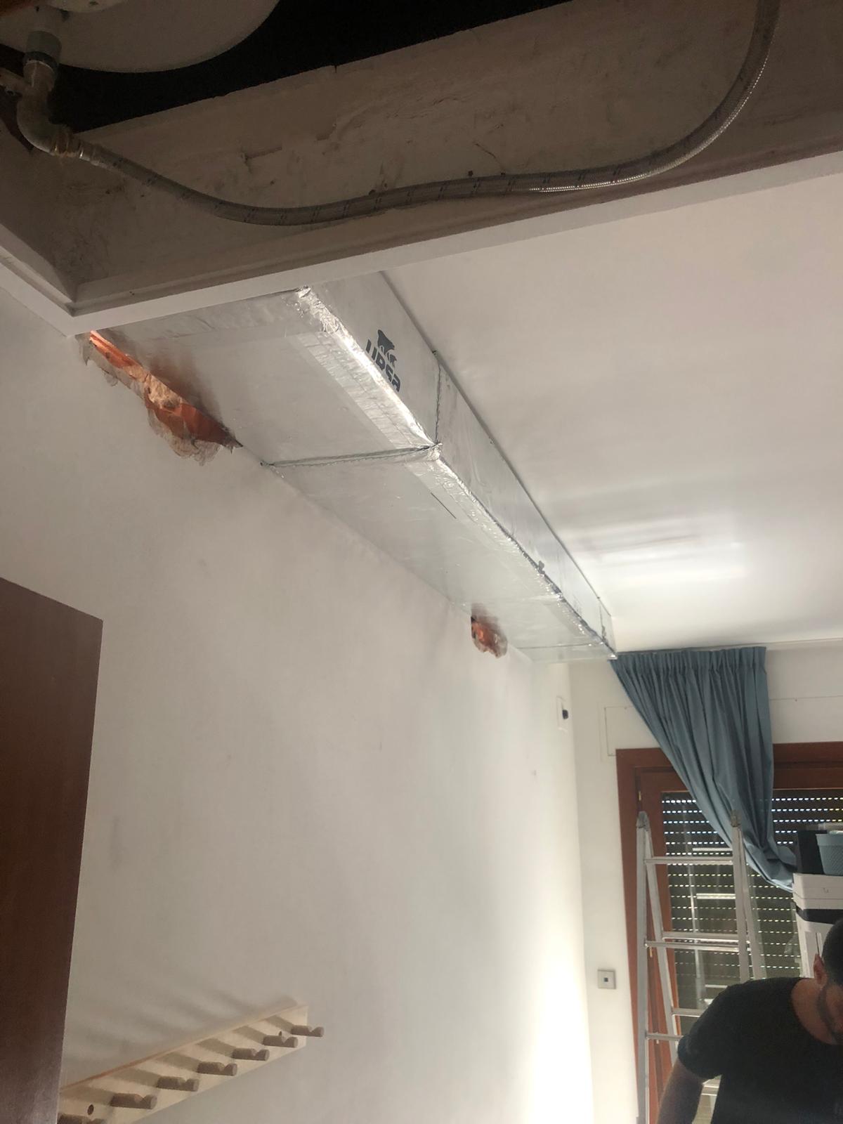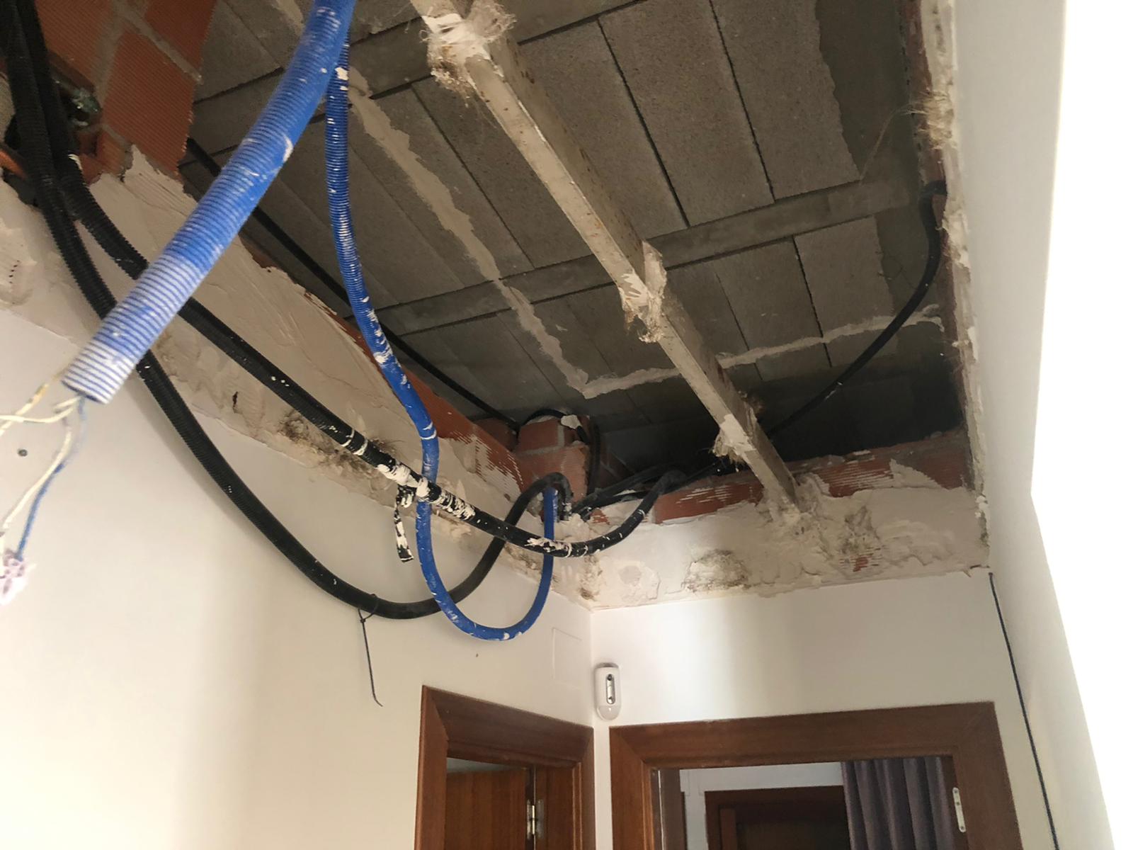 Se procede a quitar la escayola que había detrás de la pared del salón comedor y cocina y por techo del pasillo se instala los conductos de aire.
